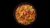 Egg noodles, chicken, mix peppers, free-range egg, our Yakisoba sauce, spring onion, sesame seed mix and katsuobushi