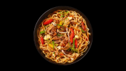 Egg noodles, slow cooked pulled beef, mix peppers, free-range egg, our Yakisoba sauce, spring onion, sesame seed mix and katsuobushi