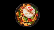 Marinated chicken, thai basil, roasted cashew, fresh chilli, a touch of spice served with steamed rice