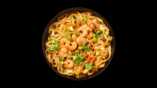 Rice spaghetti, shrimp, edamame, Bangkok sauce, fresh vegetables and egg sprinkled with nori seaweed topping