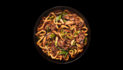 Удон спагети, дърпано телешко, шийтаке гъби, пресен лук и якисоба сос поръсено със сусамен микс