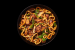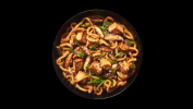 Удон спагети, тофу, шийтаке гъби, пресен лук и якисоба сос поръсено със сусамен микс